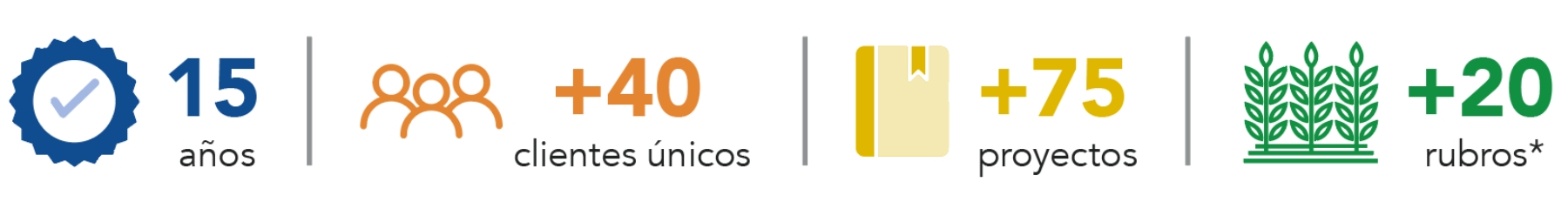 – Trayectoria de más de 15 años al servicio del sector con un equipo de consultores robusto y experimentado. – Experiencia en proyectos a lo largo de toda la cadena agroproductiva. – Amplitud en nuestra visión de negocios. – Contamos con un portafolio de herramientas probadas. – Acompañamiento integral desde la fase de diseño hasta la ejecución. – Desarrollo de relaciones sólidas, de confianza y de largo alcance. – Absoluta confidencialidad de la información de nuestros clientes.